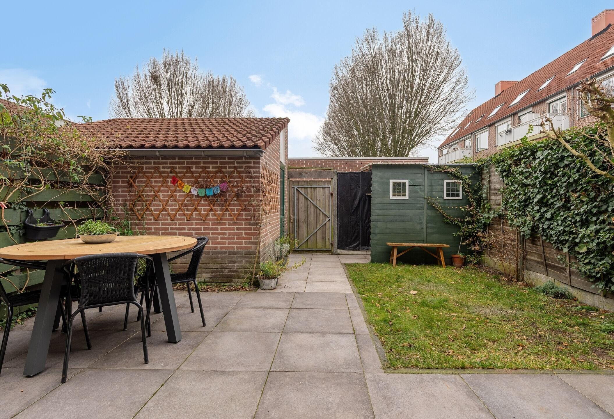 En dan die heerlijke tuin… Laten we zeggen: groot genoeg voor een borrel, een boek en het gevoel dat je even niet in de stad woont. In de tuin staat ook een fijne berging en heb je een achterom.